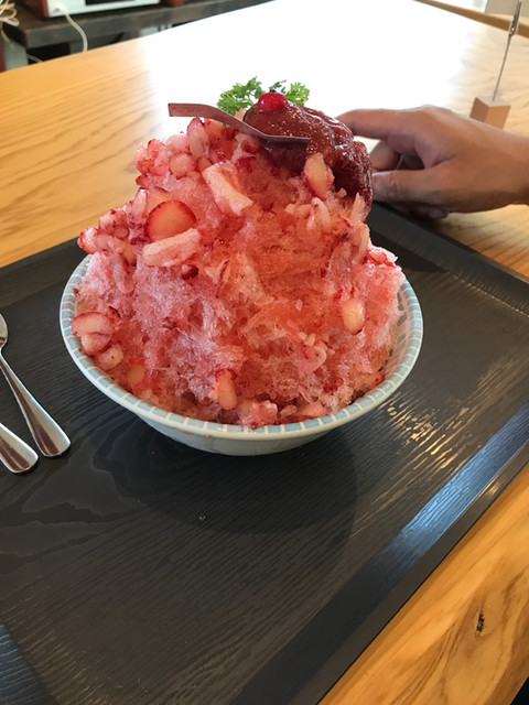 いちごかき氷は、氷自体にいちごが入ってるのかな?とてもふわふわで福岡市内じゃ500円じゃ騒動が起こるレベルです。