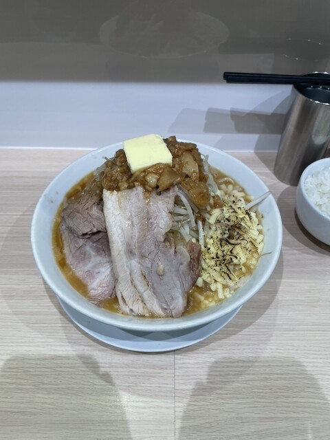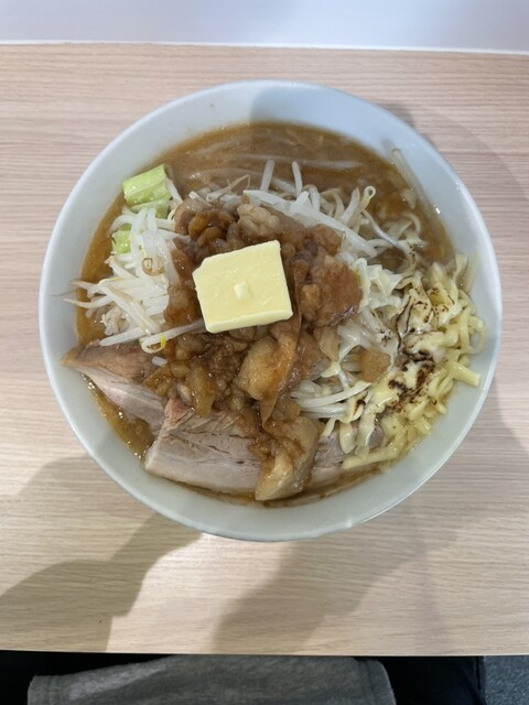 ベースの豚骨に濃厚な味噌のコクと香り!ワシワシの極太ちぢれ麺がバッチリ合います!マー油香る特製アブラが味が濃くてヤサイ、麺、スープ、そしてごはんに!バターでさらにコクと炙りチーズで香ばしさとトロトロがプラス!大きな豚は柔らかくて食べ応え抜群!めっちゃおいしかったです!ごちそうさまでした!