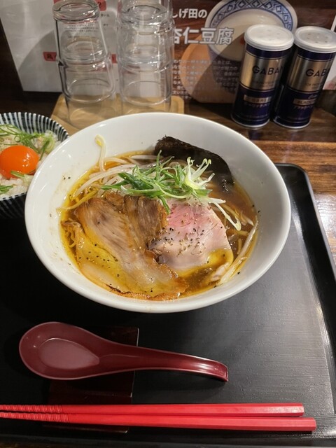 ごま、醤油が香るスープはがっつり甘口!甘口の後に動物系と魚介の旨み!ブラックペッパーがより甘さを引き立てています!京小麦の麺は噛むとはね返すような弾力とモチッとした食感!炙った煮豚は柔らかく脂がとろける!レアチャーシューはしっとり旨み!シャキッともやし!月見鶏めしはお出汁が効いていて卵黄を絡めてまろやかに!最後はスープをかけて!めっちゃおいしかったです!ごちそうさまでした!