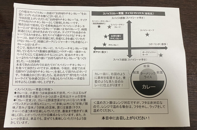 お持ち帰りはスパイスの香りの鮮度の問題でパウダー状にしたスパイスも多いみたいなので店頭でさらにスパイスの効いたスパイシーチキンカレーを食べてみたい。