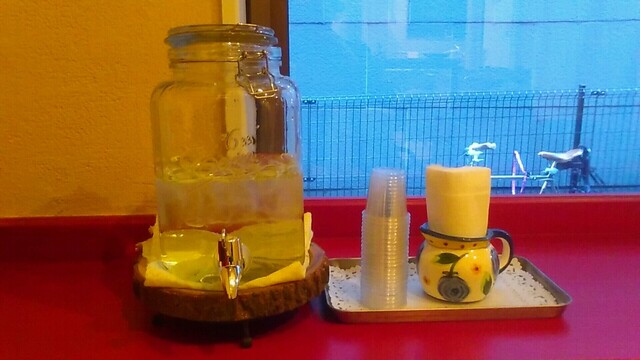 スタンドカウンター☆ミネラルウォーターもセルフで頂き♡ 背向かいにはちょこんと座れる木製長椅子もありました