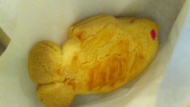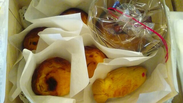 買った品々♡右上の大きい袋が焼き林檎♡ 右下のエッグタルトに追いやられてるのが(笑)お魚ちゃん♡ 他はエッグタルト♡