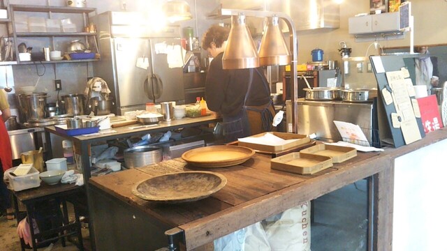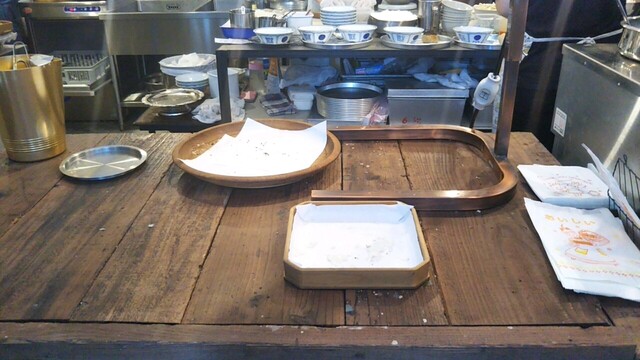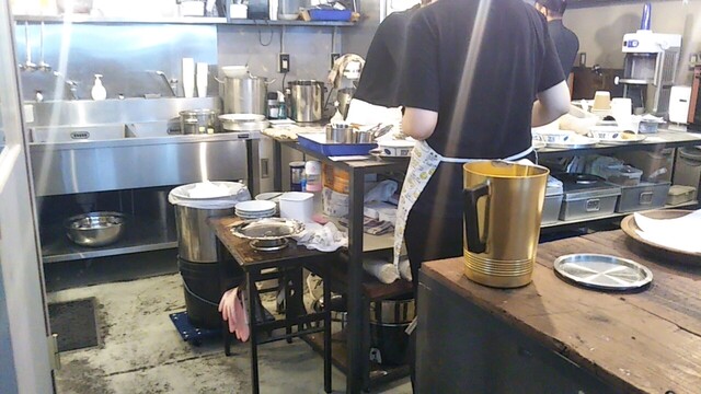 手前の下膳カウンターから調理場(トッピング)辺りを写メ