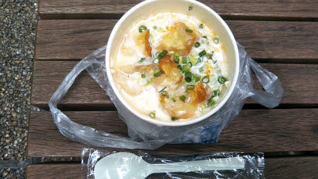 テイクアウトで頼んだ豆乳スープスプーン付きです 蓋がシッカリ閉まる容器なので全く漏れませんでした
