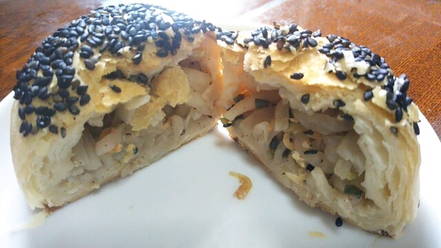 中身は餃子の餡みたいだけど皮がパイ生地の様でした。豚肉のほんのり香る八角っぽい…スパイス使ってるのかな?台湾ぽくて好きです。小ぶりなので豆乳スープのお供にもピッタリ