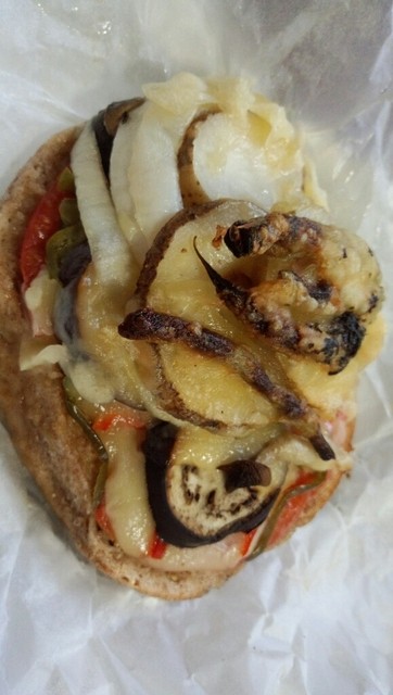 ピザベーグル。別のアングルで(笑) 美味しそうな野菜達とチーズのコンガリ具合が食べてみたい気持ちを掻き立てるヾ(≧∇≦*)/ トマト好きな人が羨ましー