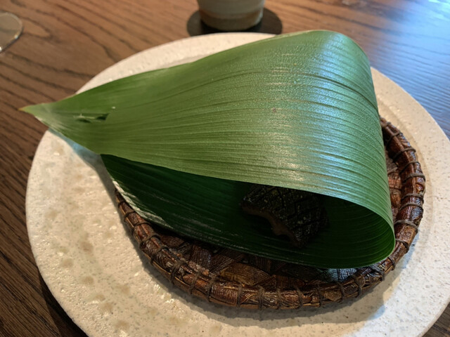 その出汁でタケノコにゆっくりと火入れしジャスミンティとヤリイカのソースを合わせたものらしい