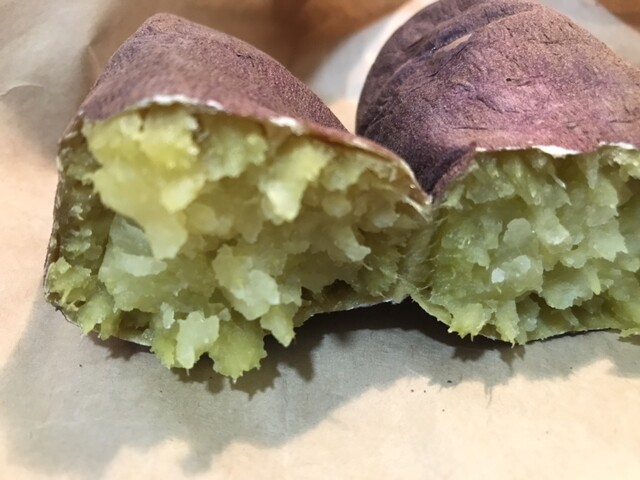 2つに割ると、ホクホクの証の断面とお芋の香り。ホクッとしっとりした食感とお芋ならではの甘さ!蜜とはちがう甘さにうっとり。今日は長さ