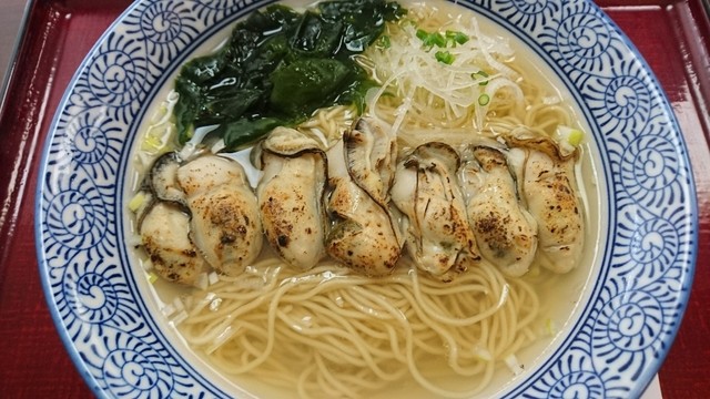 まずはスープを一口。濃すぎず、薄すぎず絶妙な味です。トッピングの牡蛎の風味も一緒に味わえて食欲MAX。細ストレート麺にもよく合います。今回は牡蛎がたくさんあるので気持ちに余裕があります。最初から牡蛎を一粒。ん~!これこれ、この味を食べに来ました。別盛りの牡蛎はそのまま頬張ると牡蛎の旨味が口一杯に広がります。トッピングのワカメ、春菊も良いアクセントです。