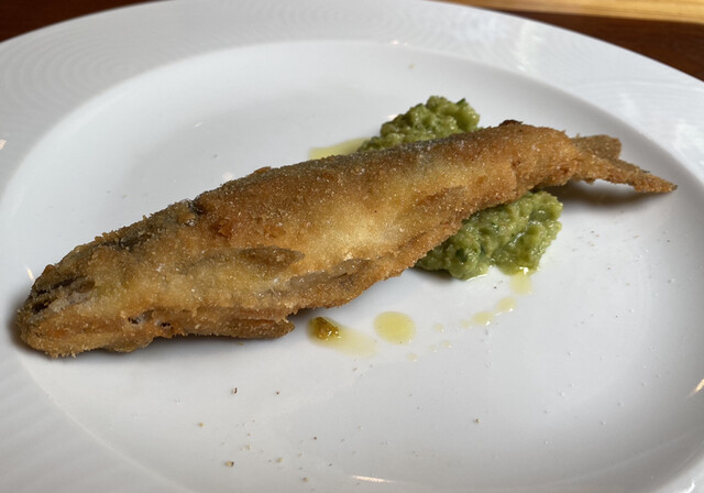 前菜は鮎のフライに卵のソースがけと、コーンのスープ。またもや最初から絶品のパンチ!コーンスープはコーン好きにはたまらなく美味しく、しっかりしたコーンの味。何重にも味がしました。