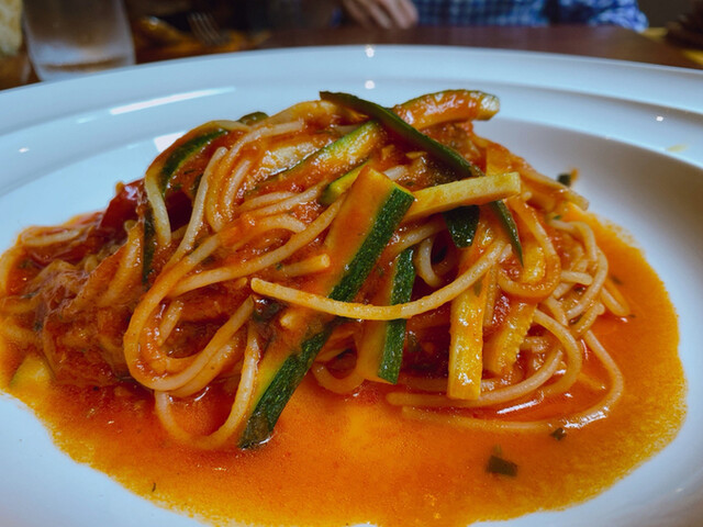 パスタは茄子の煮込みのソースとアラビアータ。アラビアータは結構辛さがあり、辛いもの好きな私にはグット