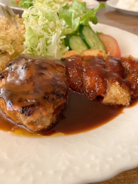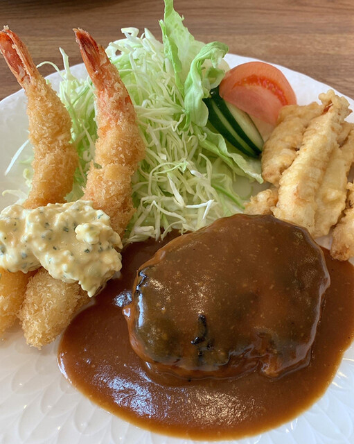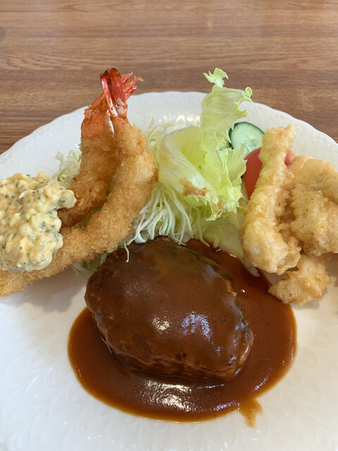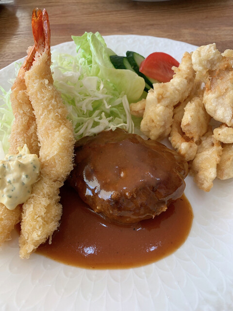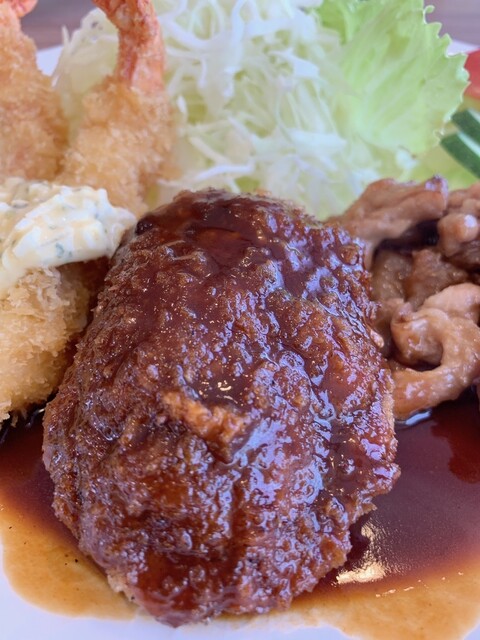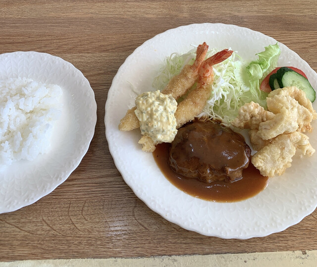 ハンバーグに海老フライ、とり天です。
