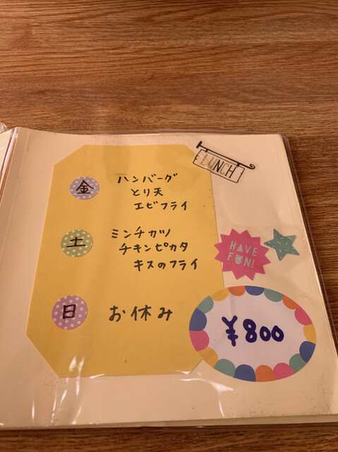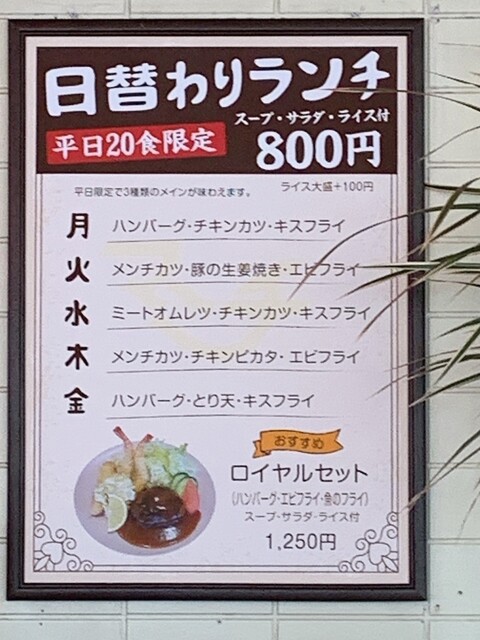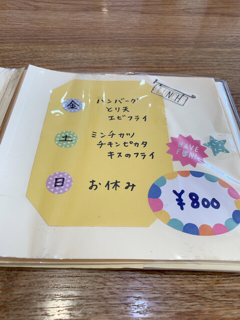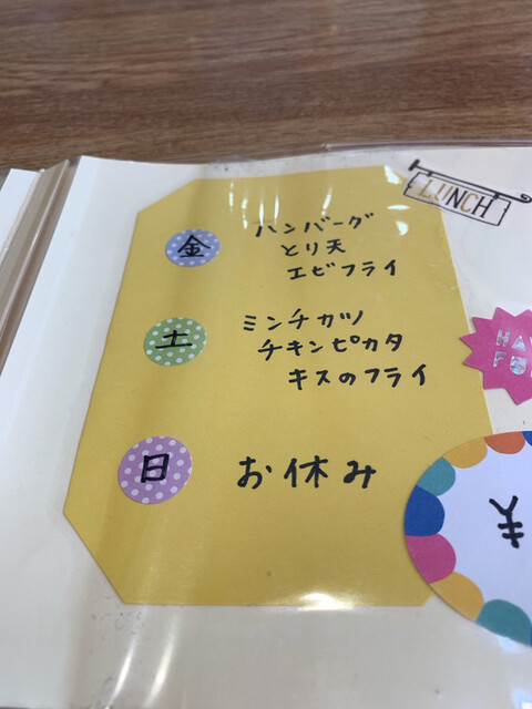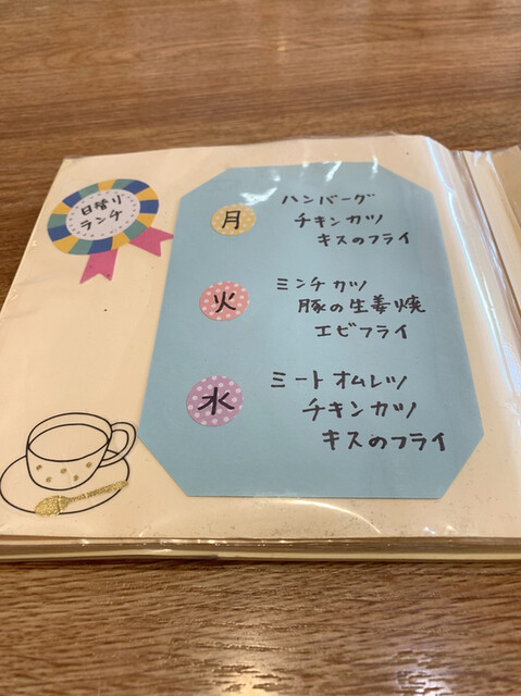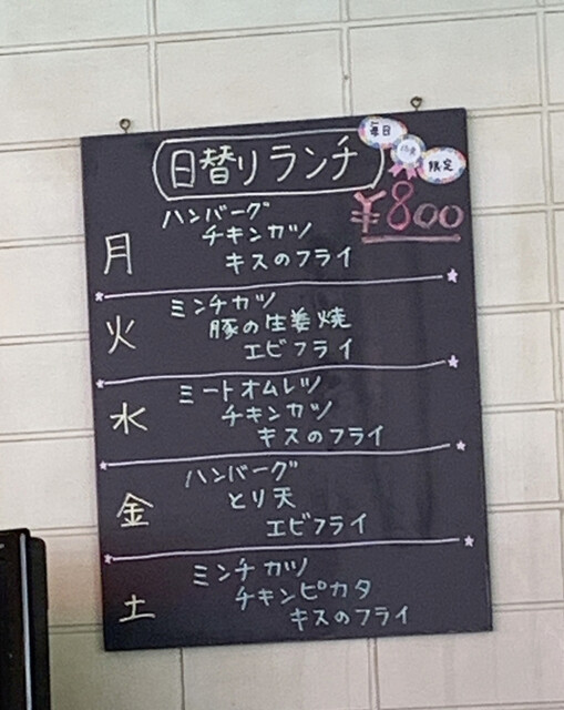 日替りは、ハンバーグ、チキンカツ、キスフライ