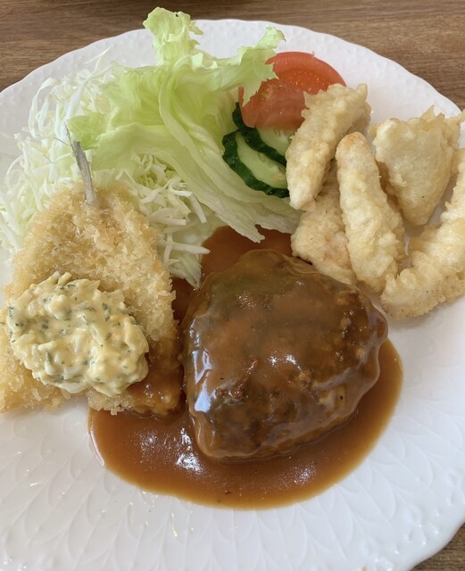 ハンバーグ、とり天、海老フライ2本。
