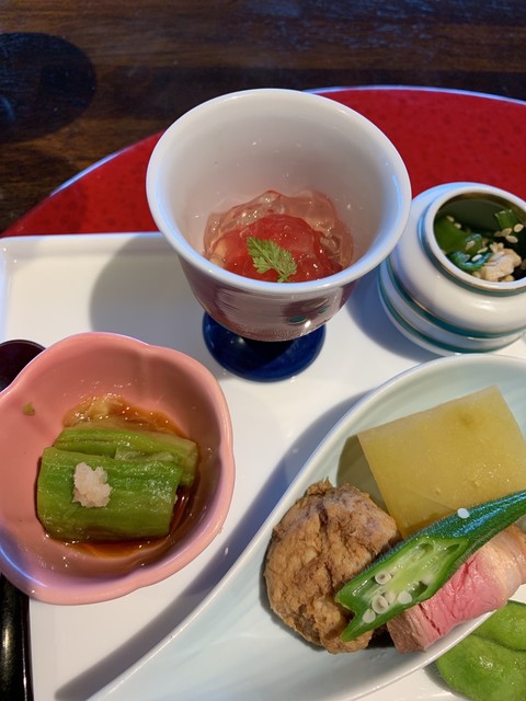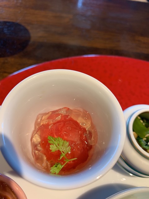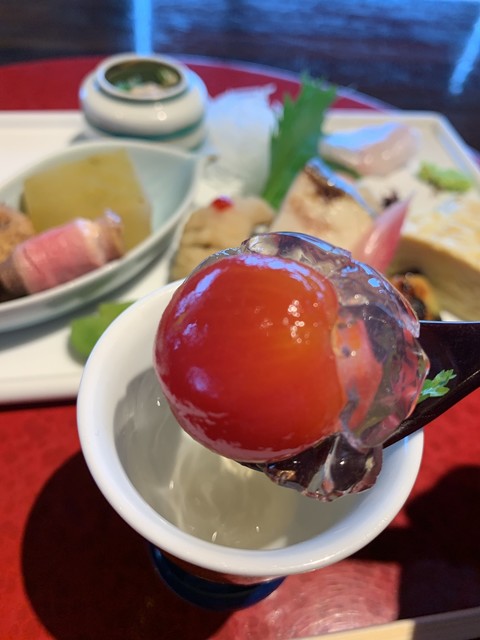 大葉の香り、ミニトマトの甘酢ジュレかけ、