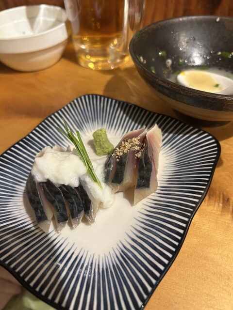 しまあじの酒当て刺し、カワハギの酒当て揚げ、しめ鯖、今宵魚の西京焼き、つまみドリアを注文。