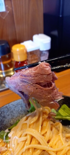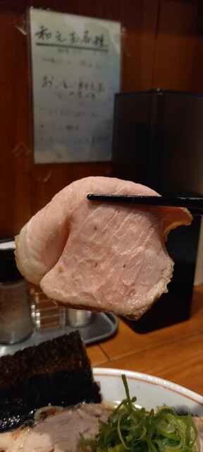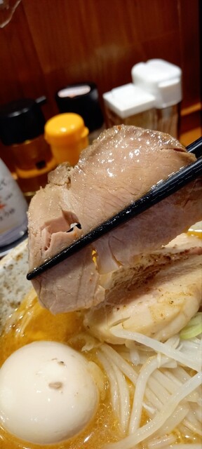 ・バラチャーシュー:存在感がある厚みです。口にいれると崩れるまで、ホロホロに煮込まれています。バラ肉でも、脂っこさよりも、肉質感を感じる仕上がりです。