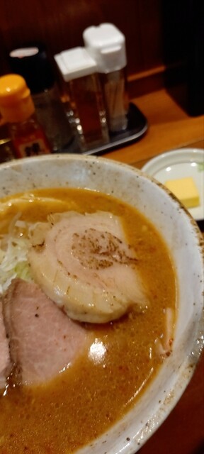バター、ブラックペッパー、味玉半分、そこに芳醇な味噌スープを蓮華で2杯!