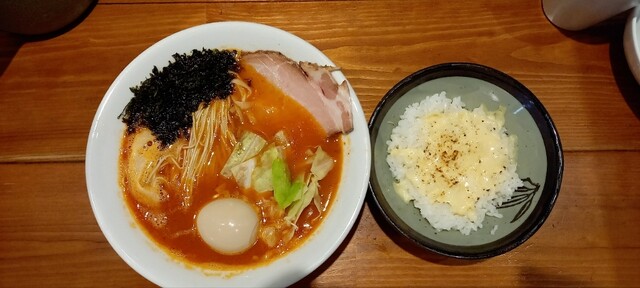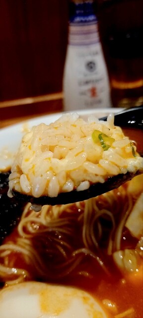 スープがあまりにもおいしいため、無料トッピングのバターの投入をやめて、追加した半ライスにオン!。
