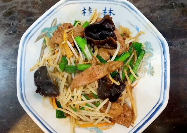 レバー、もやし、ニラ、人参、木耳を切れ味の良い甘しょっぱいタレで炒めて完成。レバーの臭みなし、さらにしっとりとしたレバーの仕上がり、これはお酒がすすみます。
