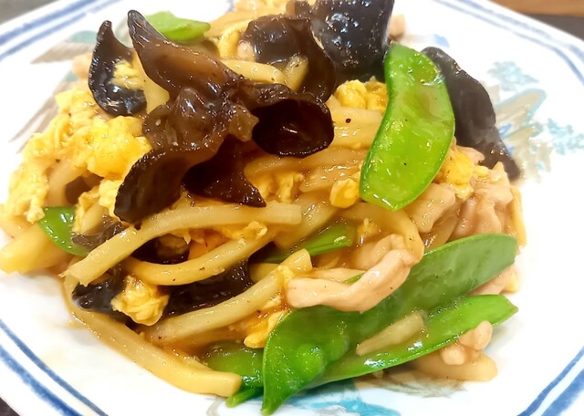 きくらげ、竹の子、豚肉、さやえんどう、卵