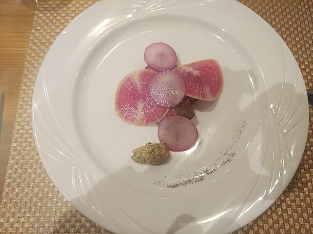 山形牛とカブ・大根のマリネ添え 山形牛の重さをマリネによって中和、カブ・大根の食感で楽しめた
