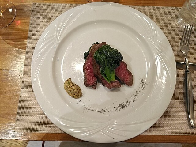 山形牛のサーロイン 赤身の美味しさもポイントだけども、マスタードと雪菜(地元食材)が素晴らしい相棒。雪菜の甘さにマスタードの酸味、マスタードに練り込まれたハーブ?の苦味がいろんな美味しさを足してくれる