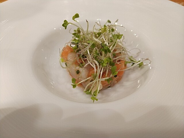 サーモンとホタテのタルタル 上のスプラウトの食感と辛味が、魚介のおいしさを引き締めていた
