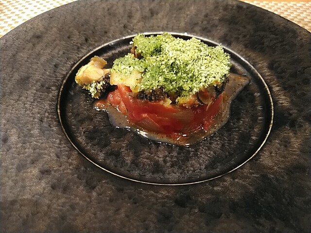 鮑のパン粉焼き お初です。下に眠るはトマト等の野菜達。鮑の焼き加減は固すぎず柔らかすぎず素晴らしかった。鮑に足りない酸味、甘味と複雑な食感を加えてくれる一品