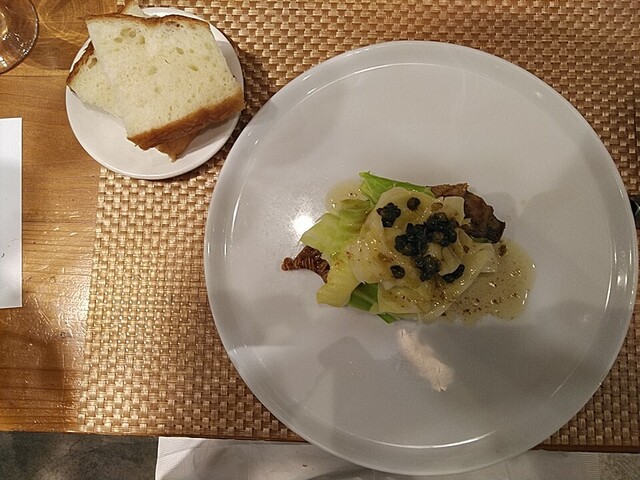 苦みと酸味の活用が秀逸で、ハーブ系の野菜や酢などの量と種類を調整し、素材の味を生かしつつ、旬の素材特有のの濃厚な油分や主張が強い味のバランスが取れており、後味の濃さに困ることもなく最後までおいしくいただくことができた。
