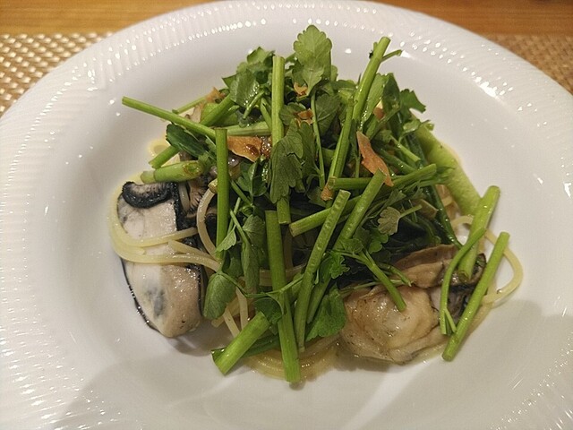 河北セリと牡蠣のペペロンチーノ 牡蠣の旨味と甘味、セリの青菜さと食感が素晴らしい一品。ネギだと辛みが邪魔になるかもなので、今しか食べられない。