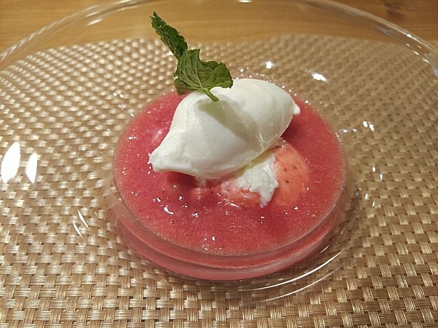 下に眠る杏仁豆腐と上のアイスで甘さを、イチゴの酸味が光輝いており、とてもいい料理でした。