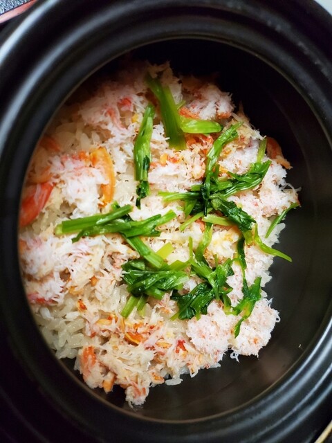 〆はカニご飯!!蟹が沢山入ってました。残りはおにぎりにして頂きました。