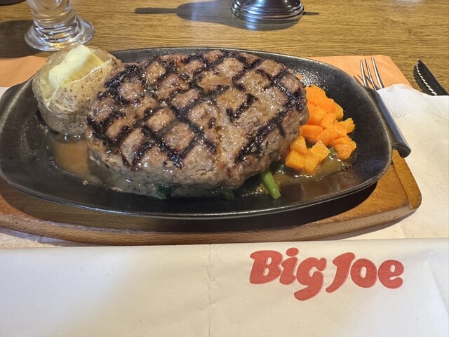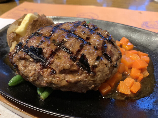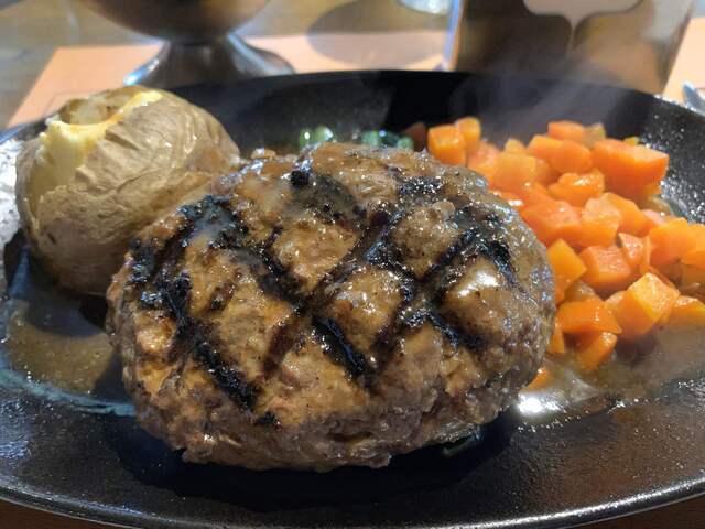 20分くらい待ちましたが美味しそうなデカいハンバーグが着丼です。こちらのハンバーグは国産牛100%で焼き加減はレアですが、お肉甘ーい味わいを最後まで満喫出来ます。下にニンジンとインゲン豆が敷いてますがこちらも熱々鉄板で食べる頃にはいい感じになります。