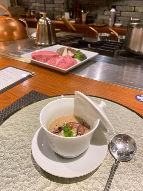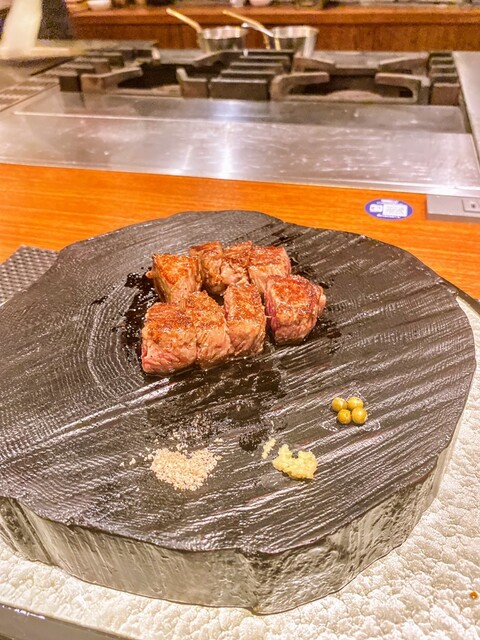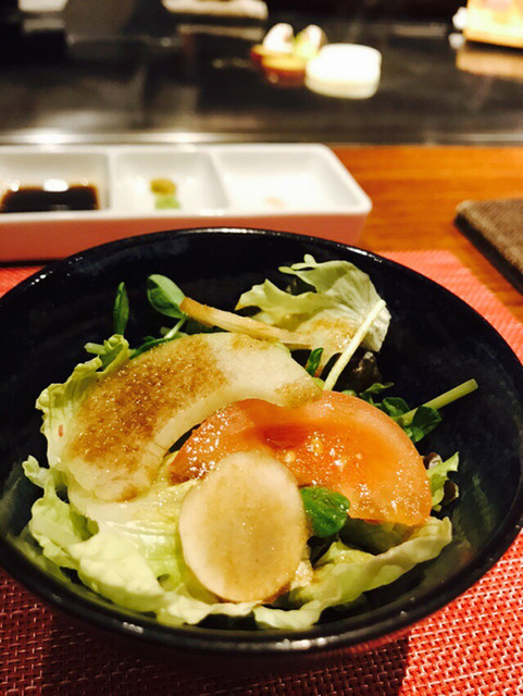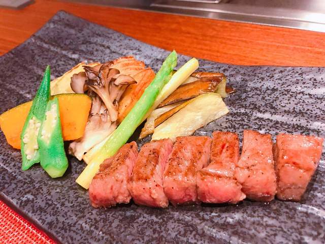 スッキリ系のレモンシャーベットでお口さっぱり&リセットした後は…メインの和牛フィレ鉄板焼き✨もちろんレアでオーダー!フィレは脂が少ないけど肉が柔らかくてジューシー❤藻塩やわさびやレモンなどで頂けます。野菜は人参がめっちゃ美味しかった!人参嫌いなのに、これは人参じゃないみたいに甘くて、ほんとに美味しかった!