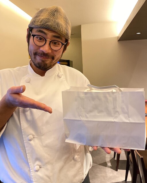 お店のオシャレなテーブルの上で写真を撮ってたら、シェフが恵方巻きを持って写真に写ってくれました