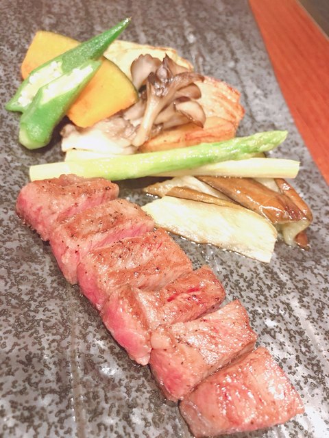 そしてステーキ。絶妙な焼き加減でお肉は柔らかくて肉汁溢れる。お肉に合うおすすめの白ワインを合わせてもらいました。焼き野菜も美味しい。ワインも進む。