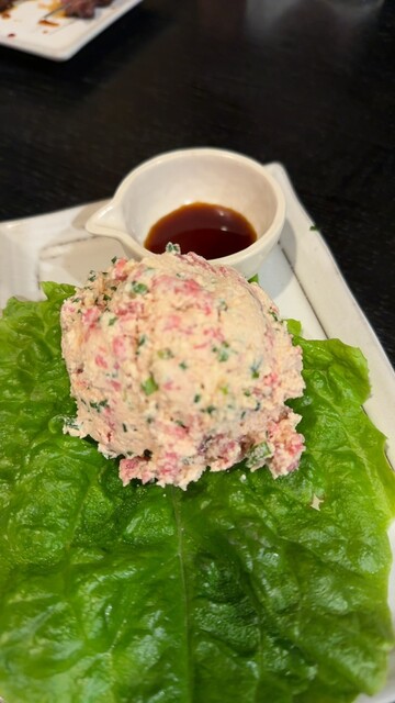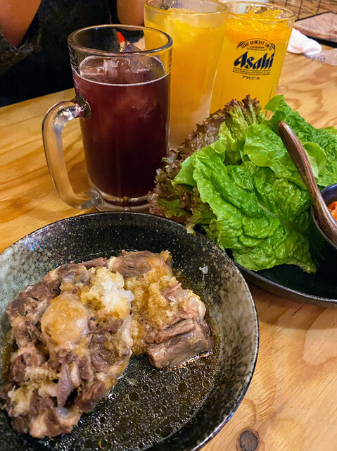 巻き巻きサラダは味付けしたお肉とキムチをよく混ぜてチシャ菜で巻いてぱくり。一口餃子も美味しい。テールポン酢はお肉が骨からホロホロと箸で取れる柔らかさ❤大好き❤