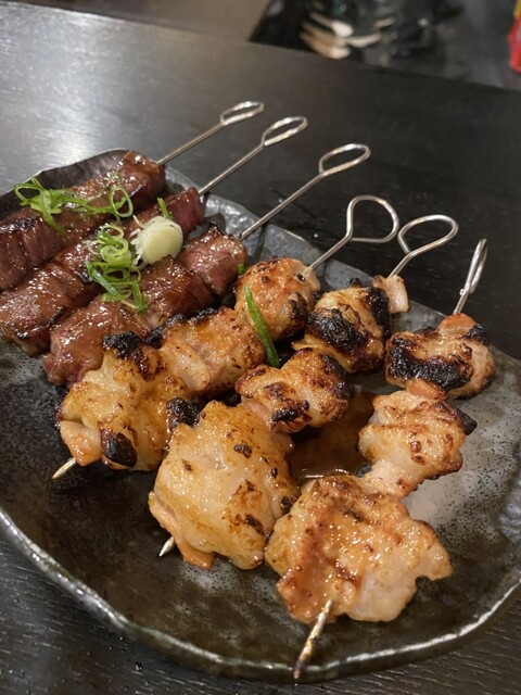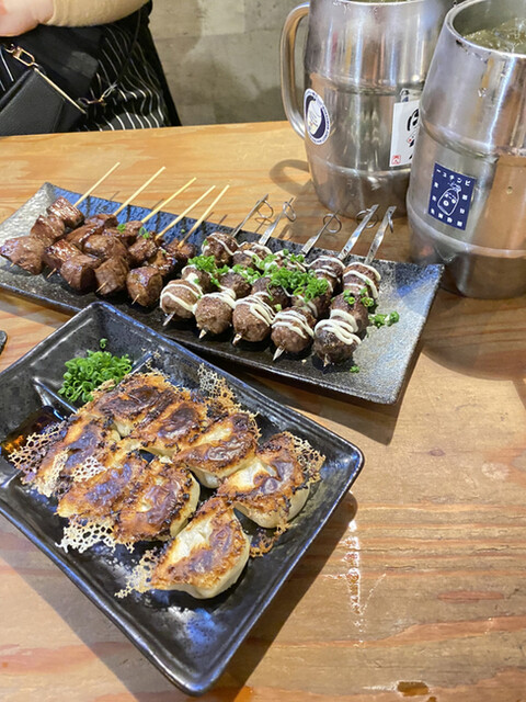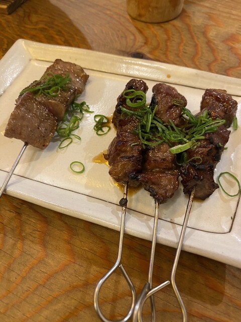 とりあえず乾杯と共にオーダーしたのは、自家製干し肉、炙りもんからやみつきホルモン串とオオカク串。