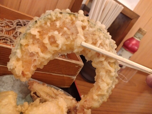 天ぷらはゲソ天、ししとう天、カボチャ天があり揚げたてサクサクで、特にカボチャのてんぷらは大きくて甘くて食べごたえがあり、いいですねー。