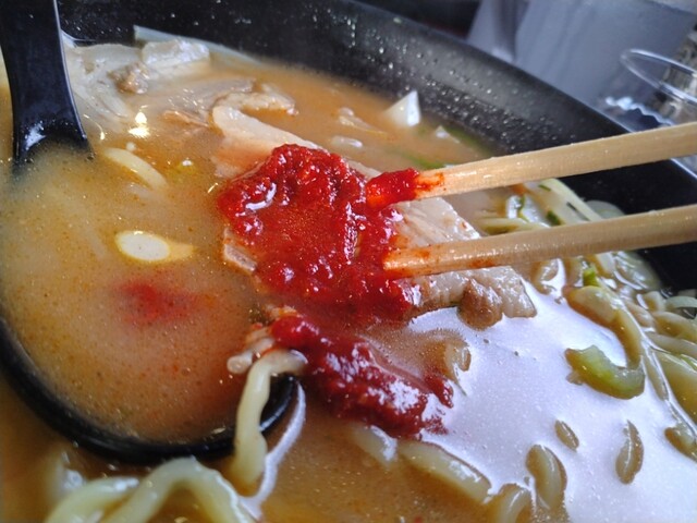 一見タンメンのような感じなんですが、そこにはブレンドされた旨さたっぷりの味噌と真っ赤なニンニクの効いた辛味噌が鎮座。
