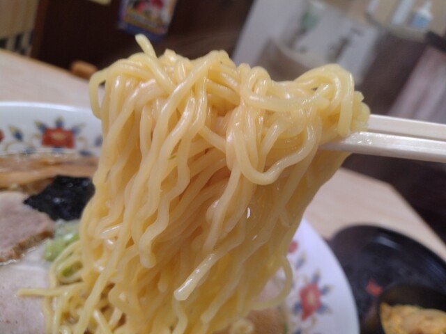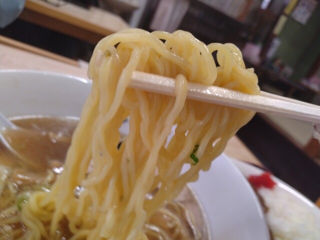 麺は中細でウェーブ、良くスープが絡んで喉越し最高です。