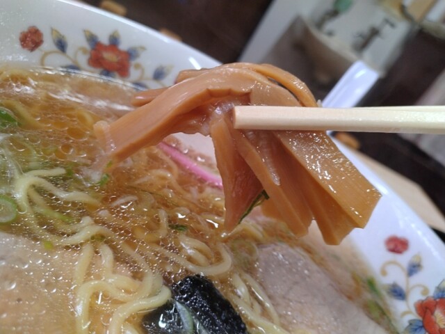 あっさりながらコクのあるスープはラードも加わりキラキラと光り、澄んでいてとても旨いです。