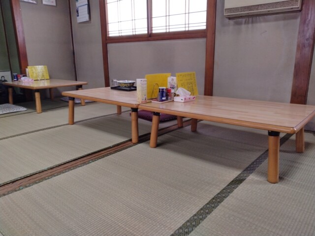 テーブル席と小上がり座敷がありますが、テーブル席は満席で誰もいない座敷へ上がり、セルフで水と座布団持ってきて座ります。