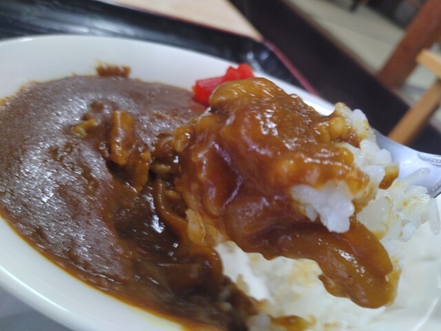 カレーは豚肉と玉ねぎのみのシンプルなもので、辛さは抑えめですが、懐かしい昔ながらの感じがとても美味しいです。