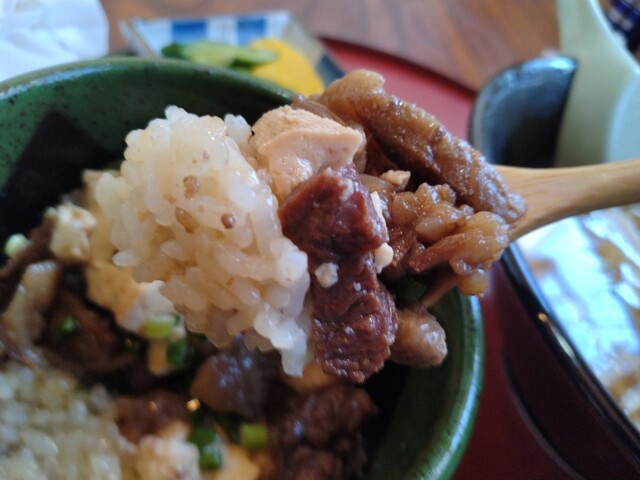 牛すじはゴロゴロ入っていて食べやすい柔らかさ、下のご飯は牛肉の脂でコーティングされてるような感じで、肉の旨味がしみて凄く旨いです。