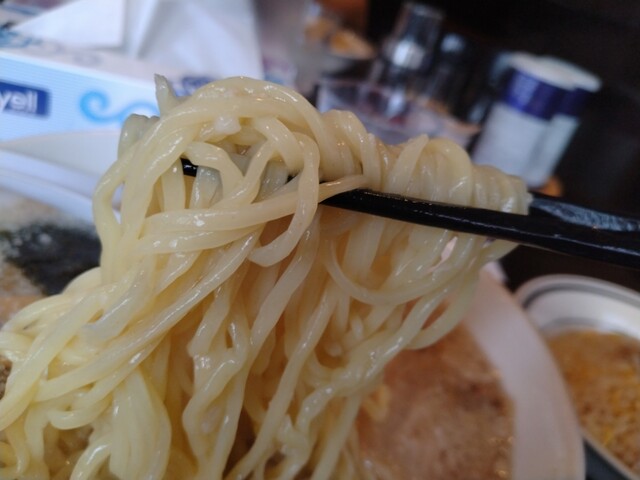 麺はギトギトラーメンより若干太いような感じですが、気のせいでしょうか?わざと太くしてるのか?プリプリモチモチが美味しいです。