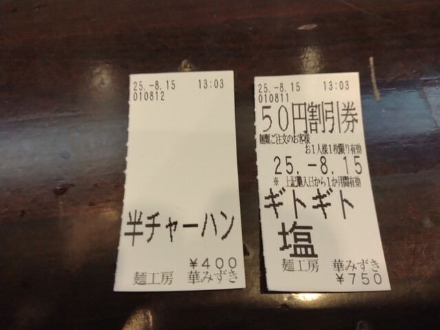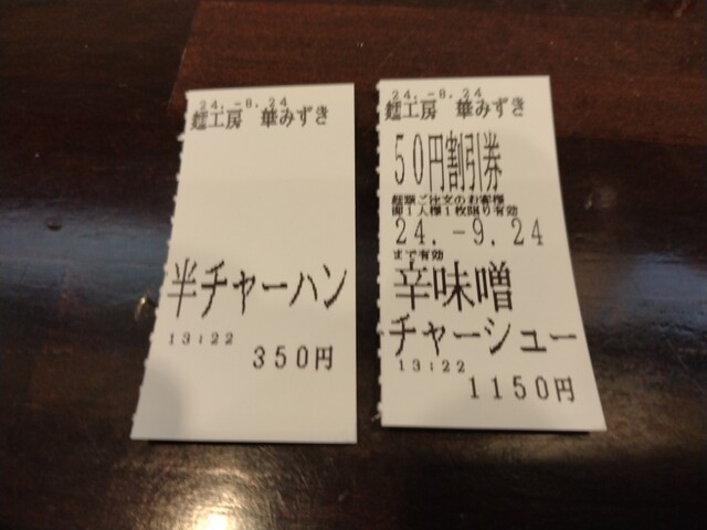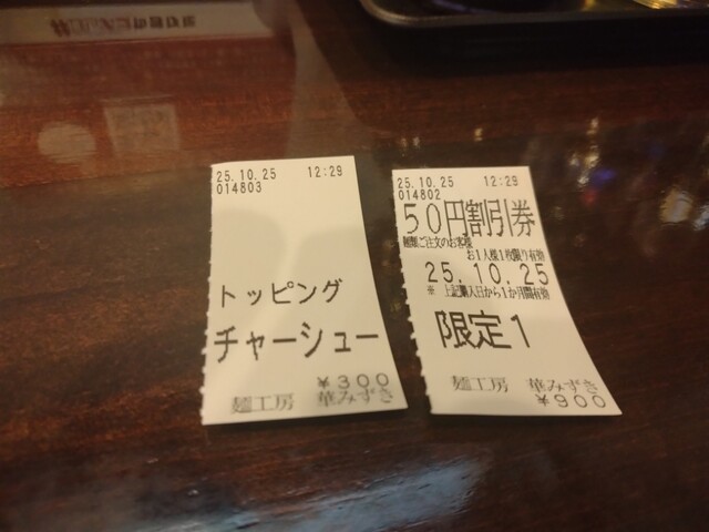 システムは券売機で食券購入したら、お店の方に渡し、席に案内されるという感じです。半券渡されますが、その中に次回使える50円割引券がありますので忘れずに持ち帰りましょう。