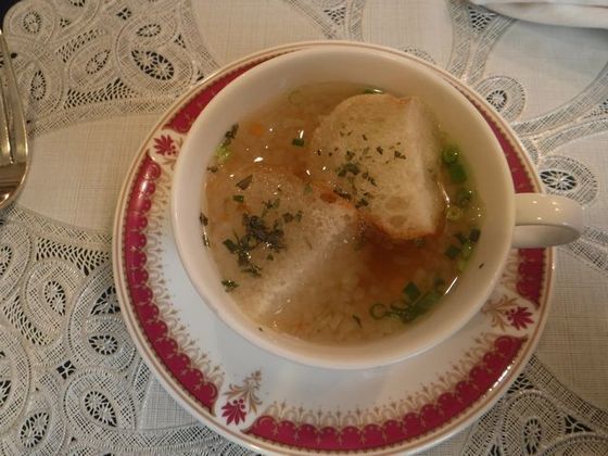 続いて出てきたコンソメスープにもパンが浸してありました。
