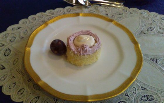デザートのケーキにはブドウが一粒付きました。